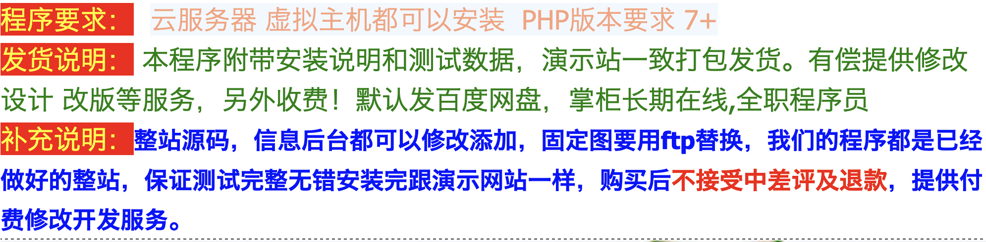 补充说明:整站源码,信息后台都可以修改添加,固定图要用ftp替换,我们的程序都是已经做好了整站,保证测试完整无错安装完跟演示网站一样,购买后不接受中差评及退款,提供支付修改开发服务。