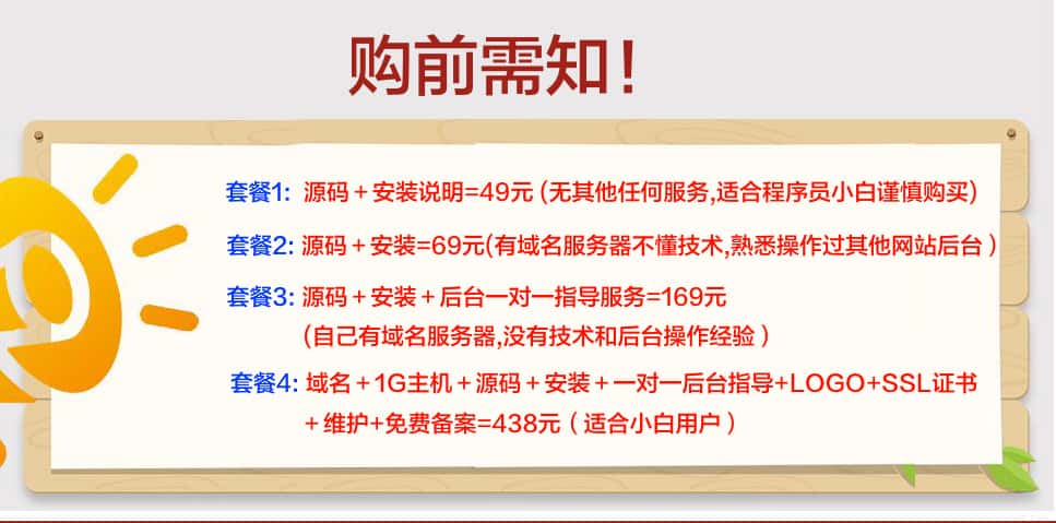 套餐2:源码 + 安装 = 69元(有域名服务器不懂技术,熟悉操作过其他网站后台)