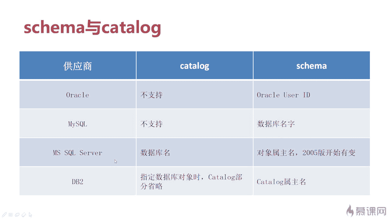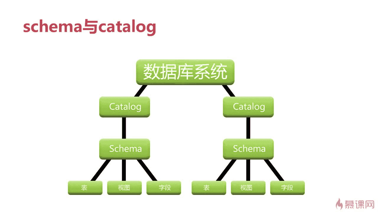 Table注解中schema(模式)与catalog(目录)的比照图. 一个数据库对应多个catalog,一个catalog对应一个schema,一个schema对应多个表、视图、字段。