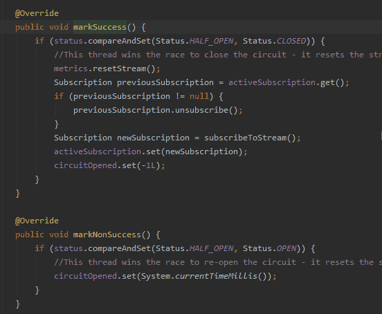 标记操作这里面的代码就比较简单了,当成功并且状态为HALF_OPEN的时候,重置stream,并且恢复断路器状态和circuitOpened到-1,假如失败则设置当前时间到circuitOpened,方便下一次sleepWindow操作。