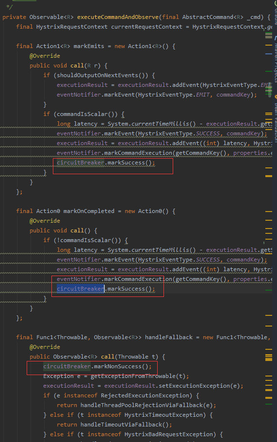 命令执行后逻辑可以看到,当命令正常完成,会调使用断路器的markSuccess操作,而异常到了fallback中则会执行markNonSuccess