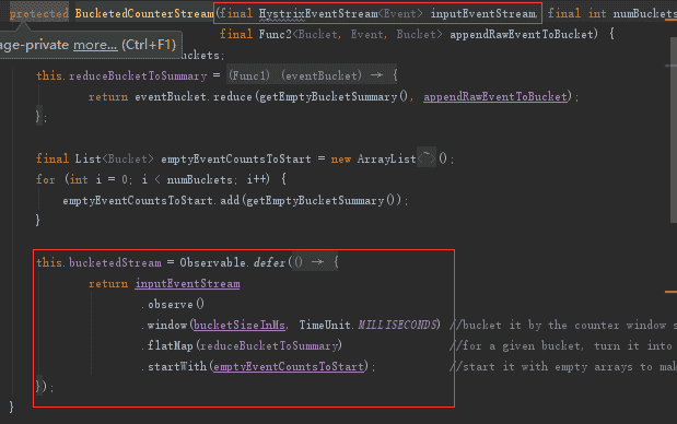 在BucketedCounterStream(HealthCountersStream终极父类)中,对这个inputStream做了少量列变换,首先通过window操作将HystrixCommandCompletionStream中所得到的事件以bucketSizeInMs的时长分割成了多个子块,而后通过flatMap操作把他们reduce成了一个bucket的summary信息,并通过startWith操作将一段empty的summary列表作为了初始的消息流。