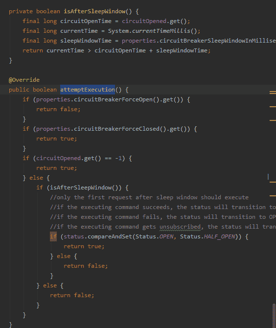 attemptExecution实现我们可以看到,在这个方法中,我们经过少量列的判断,最终查看现在距离上次断路器断开时间能否已经过去了一个sleepWindow,假如是,则将status改为HALF_OPEN,即试探状态,并且通过cas操作保证了只有第一个request能够通过,后续request继续回到fallback执行路径下。