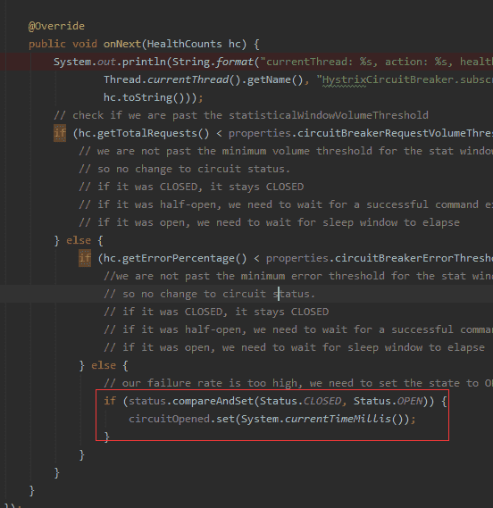 我们可以看到断路器subscribe到了我们刚刚看到的HealthCountsStream,并且在onNext中针对每次发出的消息,通过判断window中的请求数量和错误比例来控制了断路器能否断开的逻辑。整个熔断机制分析也就到了数据的终点。