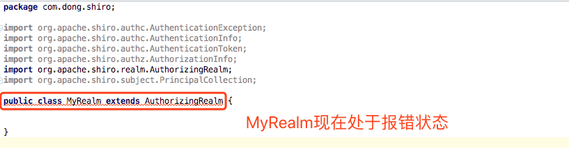 import org.apache.shiro.authc.AuthenticationException;import org.apache.shiro.authc.AuthenticationInfo;import org.apache.shiro.authc.AuthenticationToken;import org.apache.shiro.authz.AuthorizationInfo;import org.apache.shiro.realm.AuthorizingRealm;import org.apache.shiro.subject.PrincipalCollection;public class MyRealm extends AuthorizingRealm {}