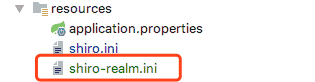 我们新建一个INI文件.取名叫shiro-realm.ini.(不做任何设置的话,项目加载的是在resources目录下或者者是resources/META-INF目录下的shiro.ini文件,这里由于我要做一个整体的Demo,所以就写两个INI文件作为区分了.) 结构如下图所示.