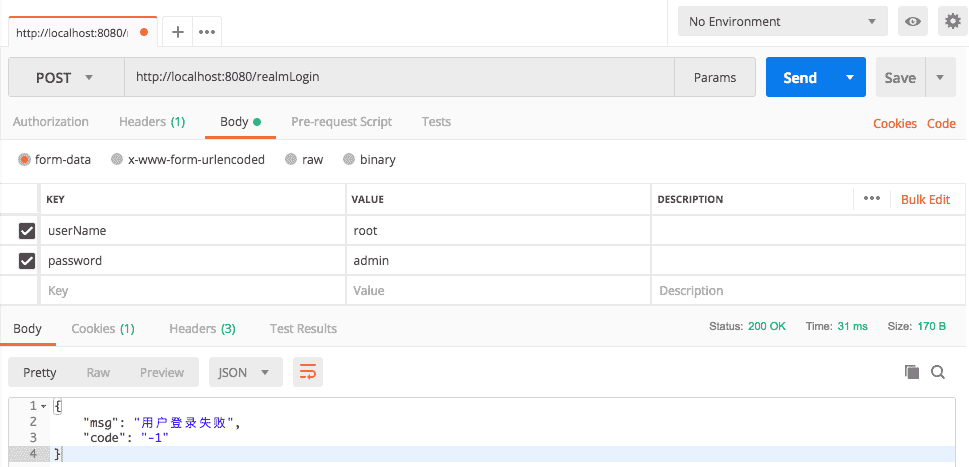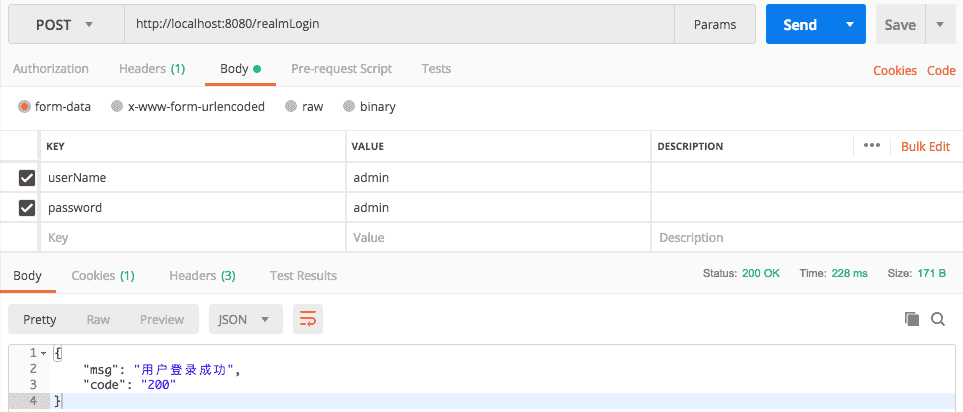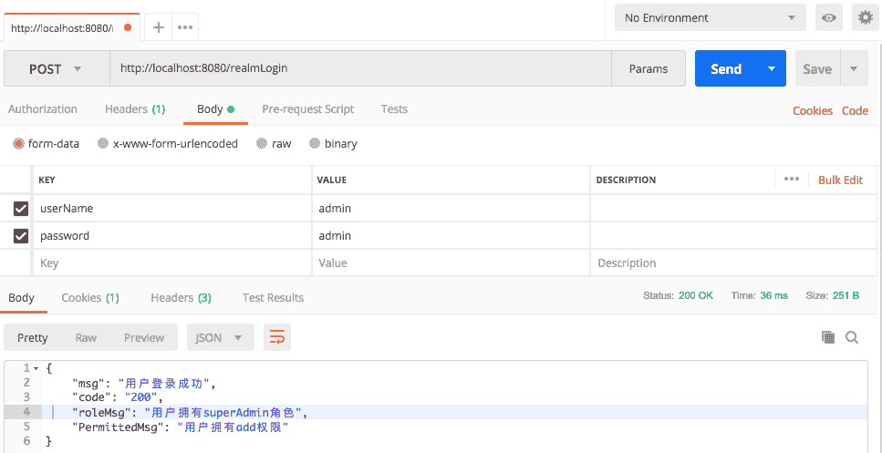 @RequestMapping(value = "/realmLogin",method = RequestMethod.POST) public Map<String,Object> userLoginWithRealmAction (@RequestParam(value = "userName") String userName, @RequestParam(value = "password") String password){ Map<String,Object> resultMap = myShiro.userLoginActionWithMyRealm(userName,password); return resultMap; }