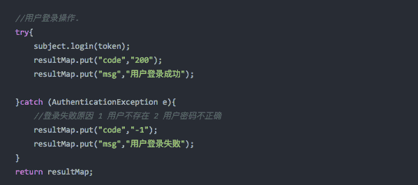 //使用户登录操作. try{ subject.login(token); resultMap.put("code","200"); resultMap.put("msg","使用户登录成功"); if (subject.isPermitted("add")){ resultMap.put("PermittedMsg","使用户拥有add权限"); }else { resultMap.put("PermittedMsg","使用户未拥有add权限"); } if (subject.hasRole("superAdmin")){ resultMap.put("roleMsg","使用户拥有superAdmin角色"); }else { resultMap.put("roleMsg","使用户未拥有superAdmin角色"); } }catch (AuthenticationException e){ //登录失败起因 1 使用户不存在 2 使用户密码不正确 resultMap.put("code","-1"); resultMap.put("msg","使用户登录失败"); }
