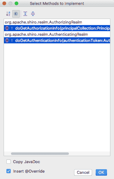 这是由于继承于AuthorizingRealm的子类必需要实现认证方法和受权方法.我们使用Alt +Enter快速创立这两个方法.
