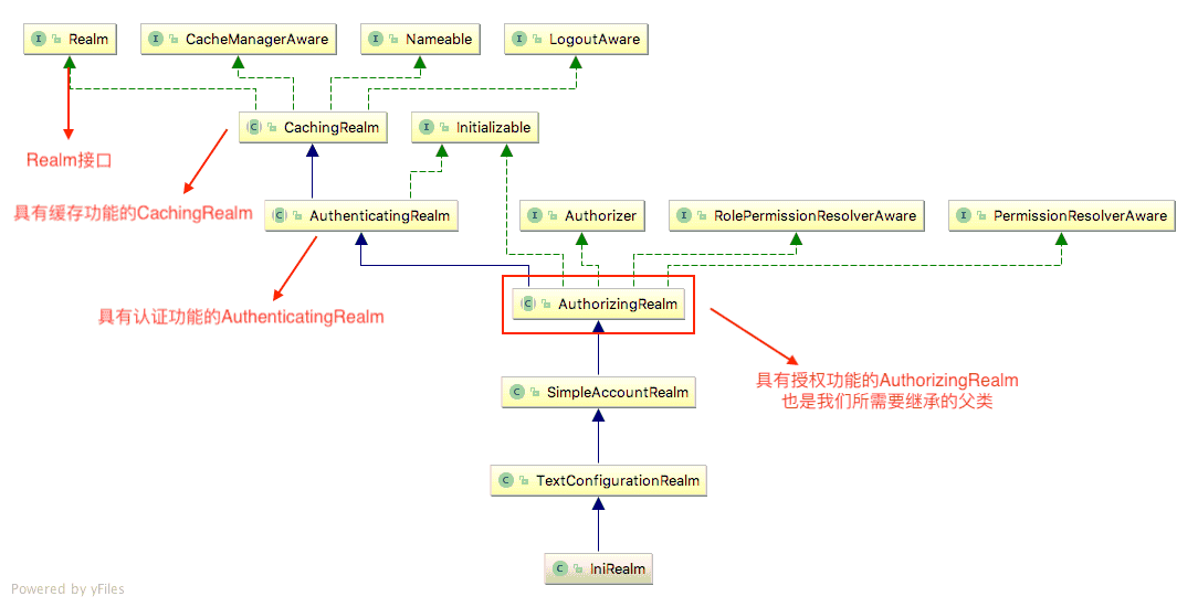 前面我们说到我们要自己设置Realm,首先我们需要先确定我们定义的Realm类中所需要的功能都需要什么,我们需要缓存功能,认证功能,受权功能,三大功能 .我们首先看一下INiRealm的继承图,从中选出最适合的继承父类,如下图所示.
