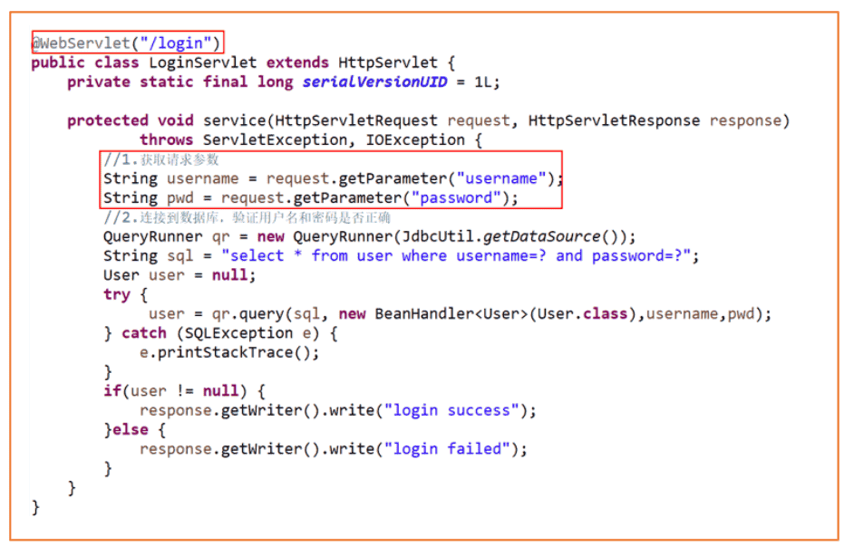 步骤1.到数据库当中创立一个使用户表 id name password email2.编写html登录页面3.创立LoginServlet 4.接收到请求时 4.1.获取请求参数 4.2.连接到数据库,验证使用户名和密码能否正确 把jdbcutils和dbutils放到web-info下的lib目录当中 把db.properties放到自己目录当中 要修改文件路径,修改成字节码的路径 Object.class.getClassLoader().getResource("db.properties").getPath(); 4.3.根据查询的结果给使用户反馈登录成功还是失败