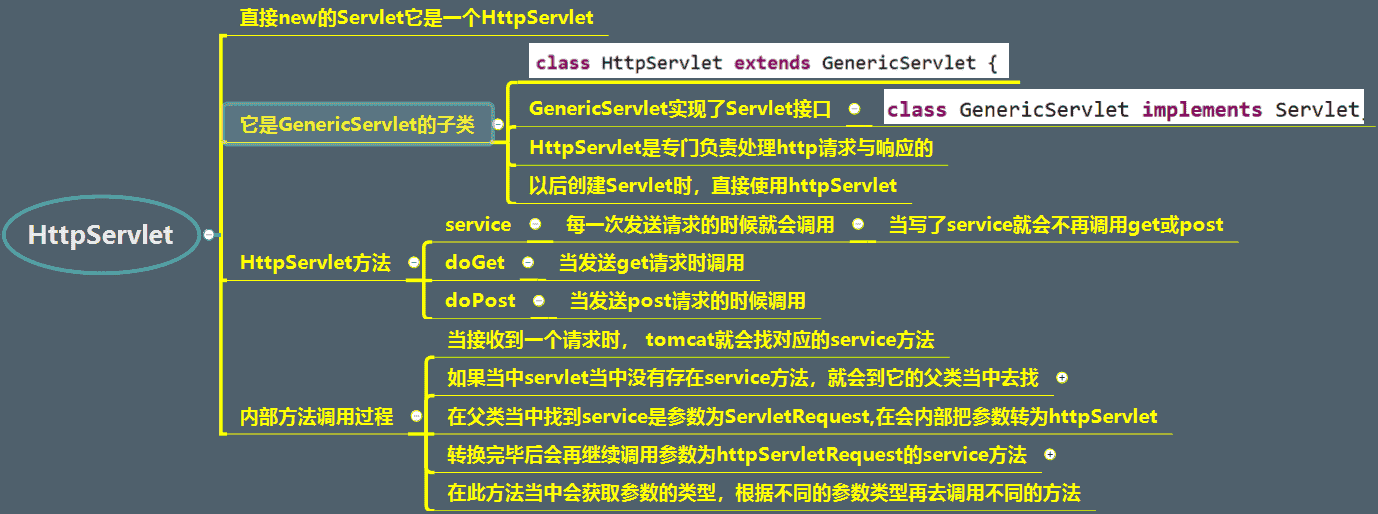 当接收到一个请求时,tomcat就会找对应的service方法假如当中servlet当中没有存在service方法,就会到它的父类当中去找 在父类当中找到service是参数为ServletRequest,在会内部把参数转为httpServlet转换完毕后会再继续调使用参数为httpServletRequest的service方法 在此方法当中会获取参数的类型,根据不同的参数类型再去调使用不同的方法