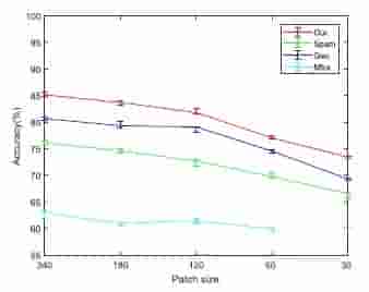 下图 3 展现了我们的方法与三种人工设计特征的方法在不同尺寸图像块上的分类精度。与其余三种方法相比较,我们的方法在任何图像块尺寸上的精确率都更高,且随着图像块尺寸的缩小,网络的分类精确率会降低。