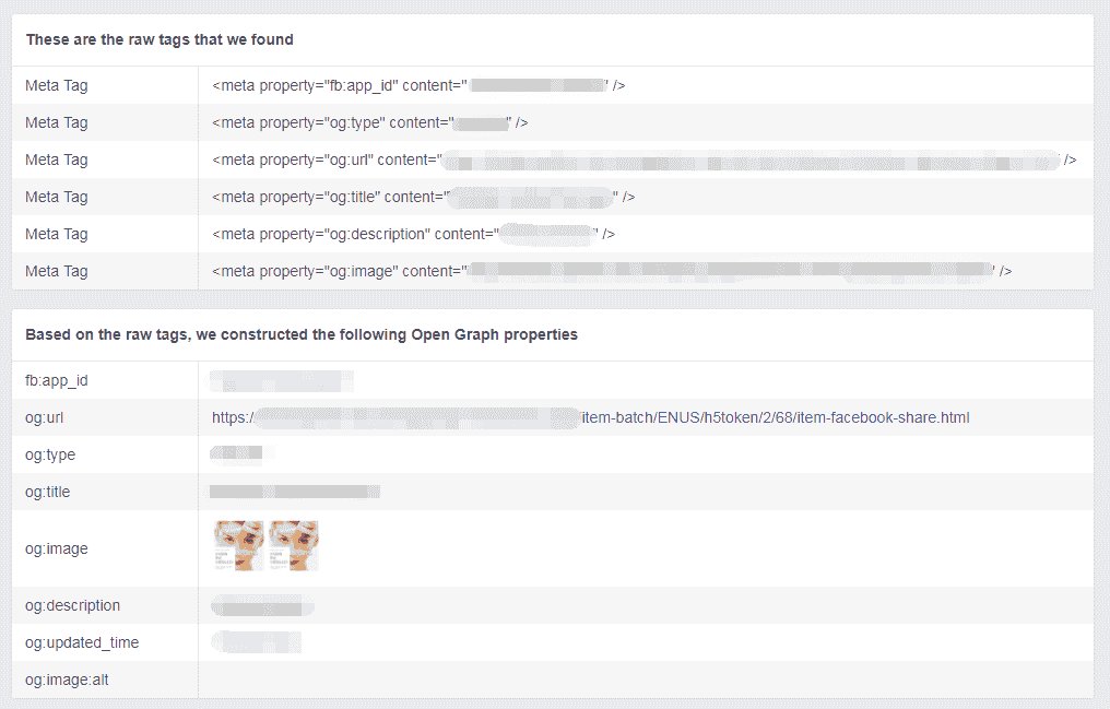 内容地址,假如你不知道facebook能否可以识别,那么就把你的网页放到 facebook for deverlopers 中测试一下,该结果就会显示出你的网页内,能否包含了必要参数,如下所示: