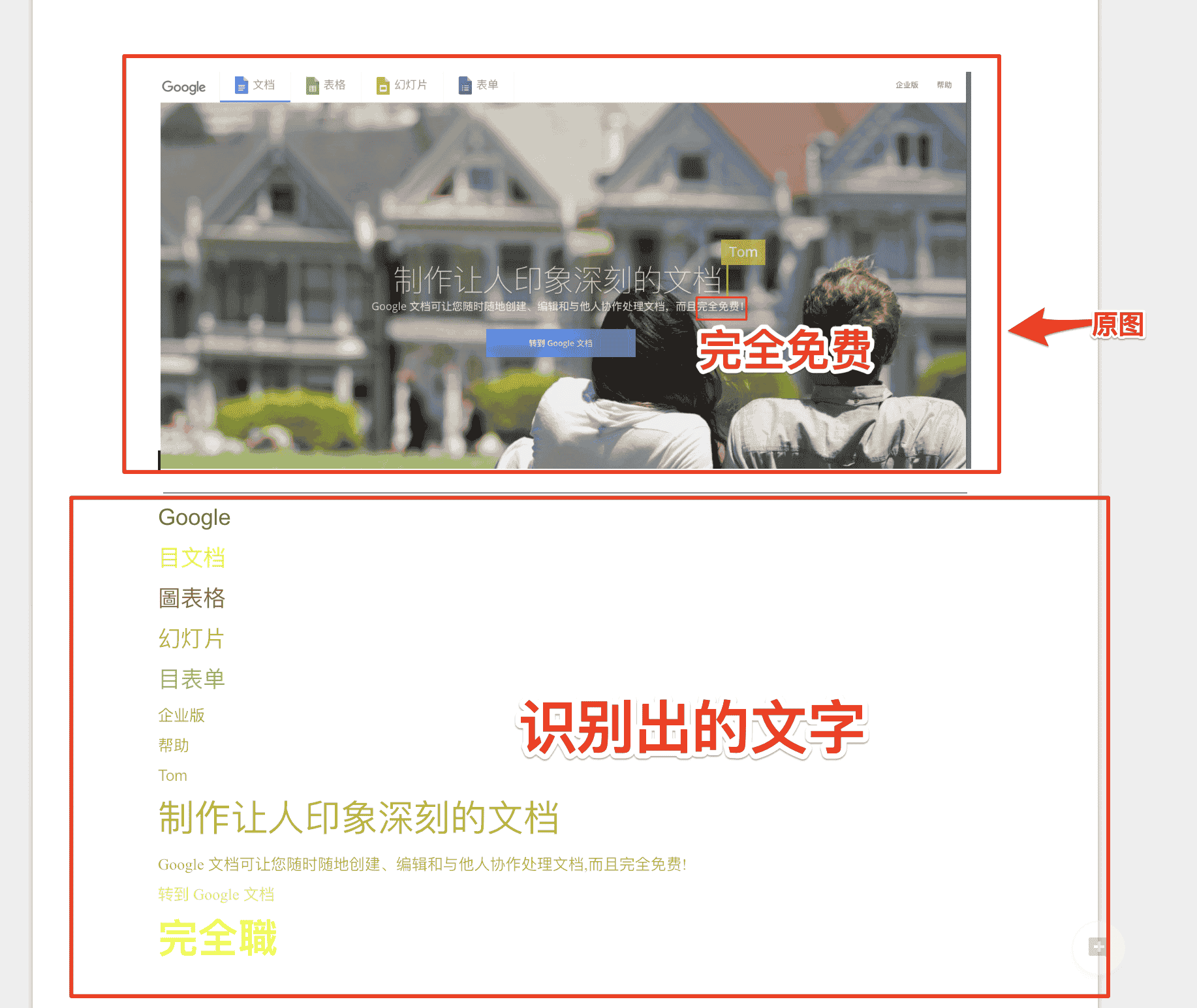 浏览器会开启一个空白标签页, 大概等5到6秒钟, 空白标签页会加载出转换的结果, 这里肯定要耐心等待 - Google在线文档很强大, 除pdf外, 普通图片上传到google文档,也可以用google在线文档打开, 打开后的文字识别效果也超级棒, 文档内会同时展现原图和从原图内识别出的文字, 感兴趣的可以自己试一试~