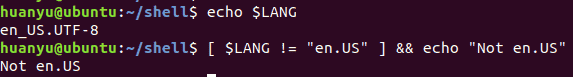 huanyu@ubuntu:~/shell$ [ $LANG != "en.US" ] && echo "Not en.US"