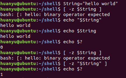 huanyu@ubuntu:~/shell$ [ -z $String ]huanyu@ubuntu:~/shell$ echo $?