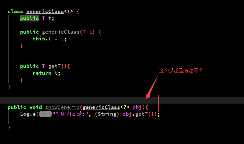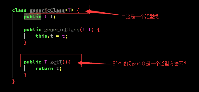 class genericClass<T> { public T t; public genericClass(T t) { this.t = t; } public T getT(){ return t; } //正确的泛型方法 public <T> T getGenericClassT(genericClass<T> obj){ return obj.getT(); } }