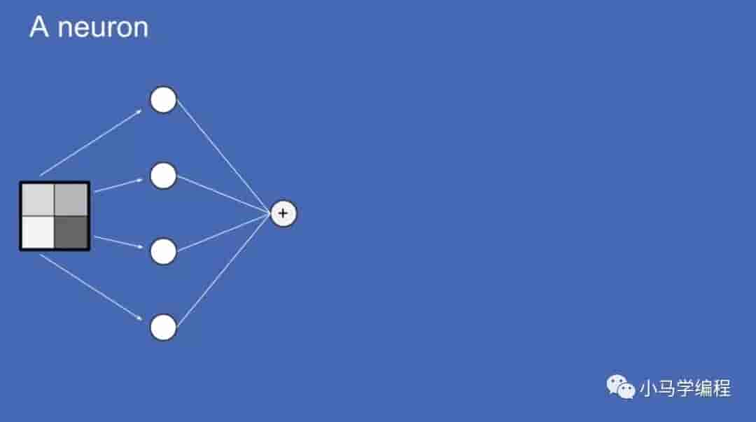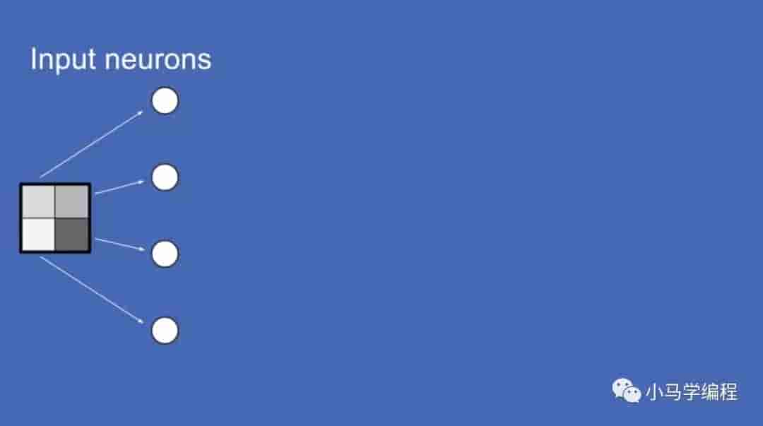 这个由两行两列的四个像素笼统为是出神经元,每个神经元对应某一行某一列的一个像素。他包含值就是像素的灰度值。