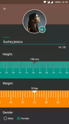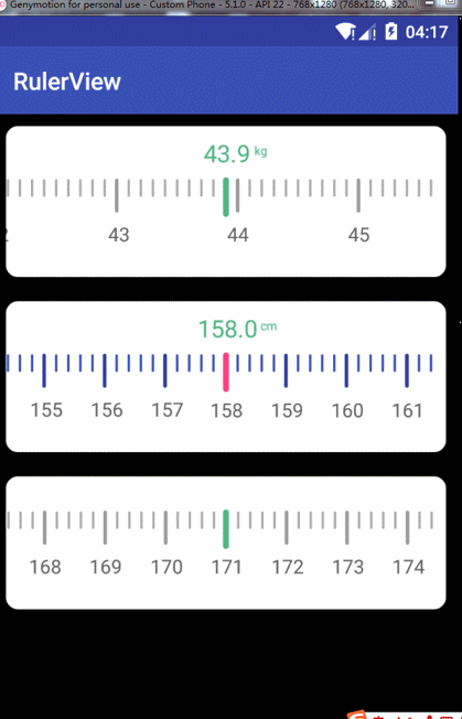一个可以滑动选择的尺子 View,可以选择体重身高等信息,通过刷新当前屏幕模拟滑动效果,达到暂用内存最小的目的。