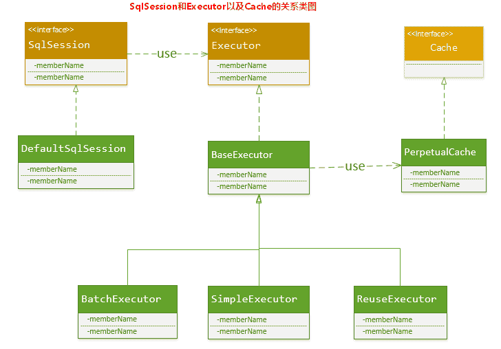 实际上, MyBatis只是一个MyBatis对外的接口,SqlSession将它的工作交给了Executor执行器这个角色来完成,负责完成对数据库的各种操作。当创立了一个SqlSession对象时,MyBatis会为这个SqlSession对象创立一个新的Executor执行器,而缓存信息就被维护在这个Executor执行器中,MyBatis将缓存和对缓存相关的操作封装成了Cache接口中。SqlSession、Executor、Cache之间的关系如下列类图所示: