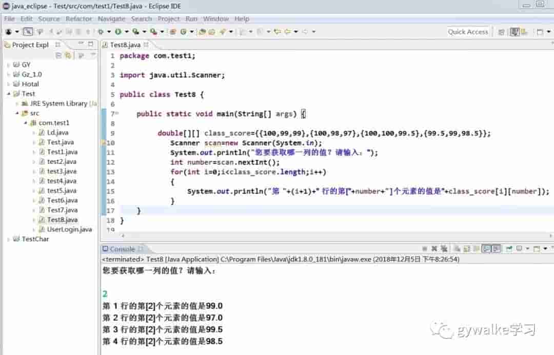 除了获取单个元素和一律元素之外,还可以单独获取二维数组的某一行中所有元素的值,或者者二维数组中某一列元素的值。获取指定行的元素时,需要将行数固定,而后只遍历该行中的一律列就可。