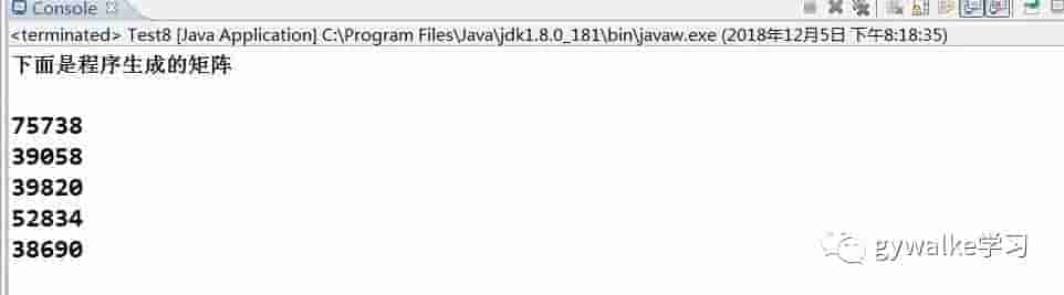 在该程序中,首先定义了一个二维数组,而后使用两个嵌套的 for 循环向二维数组中的每个元素赋值。其中,Math.random() 方法返回的是一个 double 类型的数值,数值为 0.6、0.9 等,因而乘以 10 之后为 10 以内的整数。最后又使用了两个嵌套的 for 循环遍历二维数组,输出二维数组中的值,从而产生矩阵。