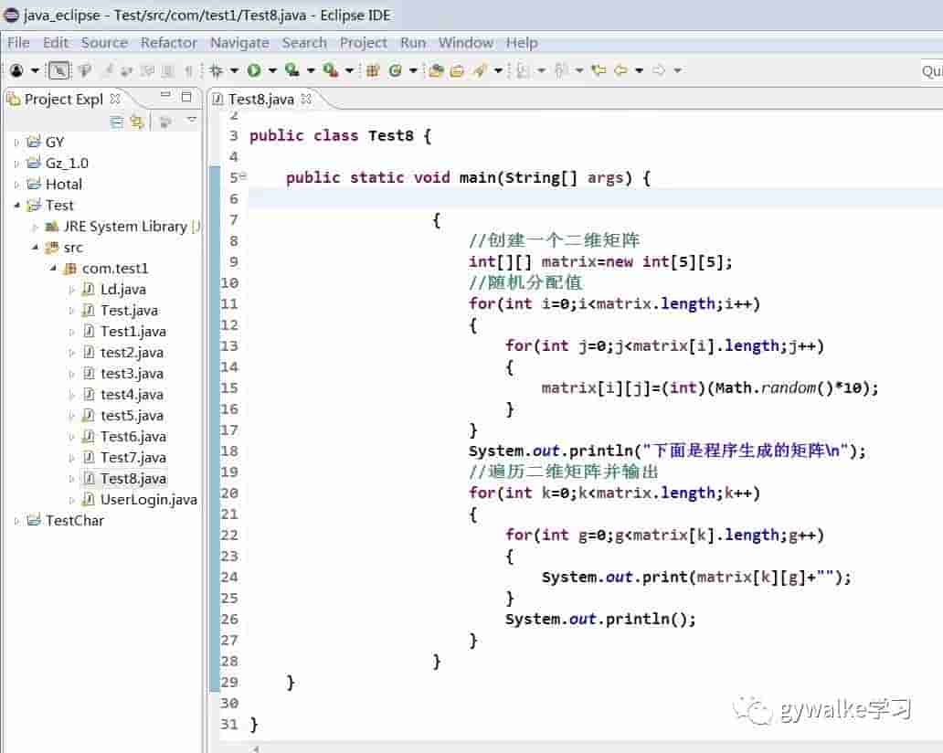 假设有一个矩阵为 5 行 5 列,该矩阵是由程序随机产生的 10 以内数字排列而成。下面使用二维数组来创立该矩阵