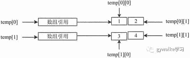 上述代码创立了一个二行二列的二维数组 temp,并对数组中的元素进行了初始化。图 1 所示为该数组的内存结构。