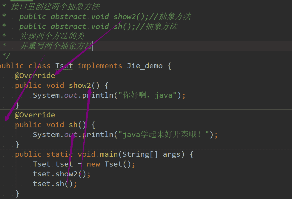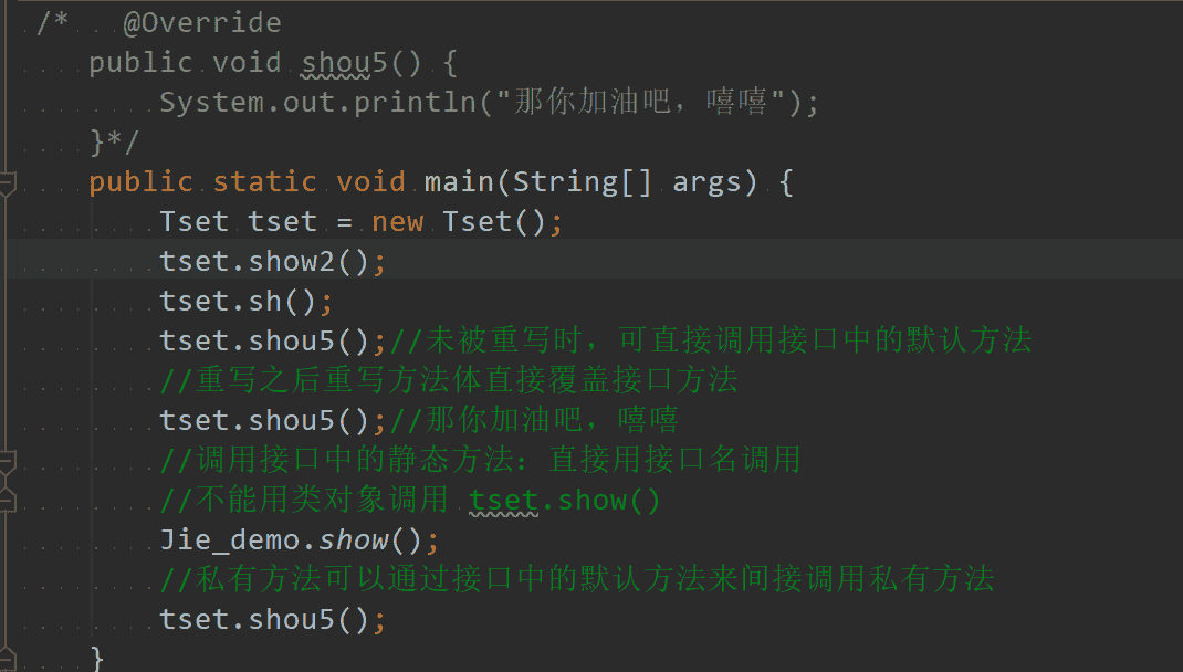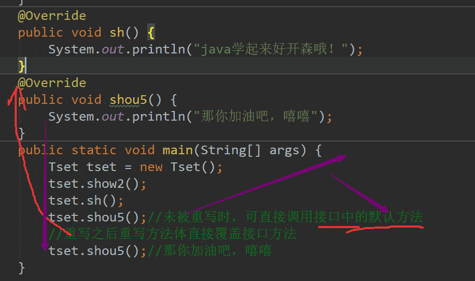 //? ? 分别实现每一个接口的方法}, 继承了接口的默认方法,就可以直接调用,也可以重写。