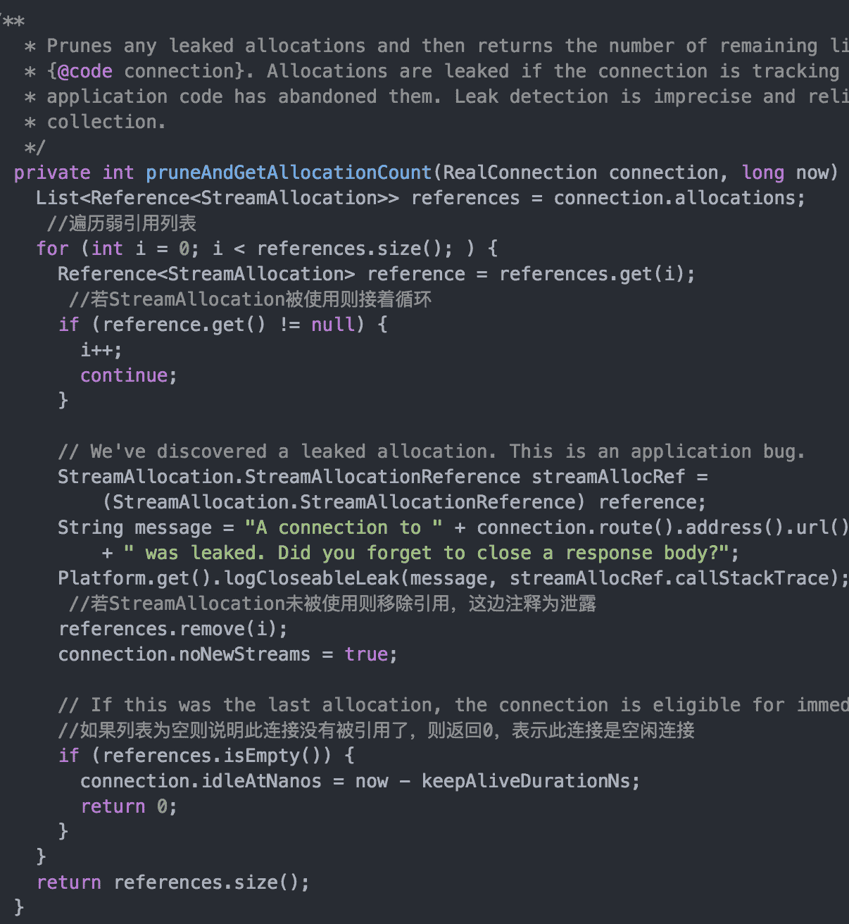 StreamAllocation创立一个Connection后会将自己增加到Connection的connection.allocations列表中,数据读取完毕之后,会将自己从Connection的connection.allocations中移除,所以判读一个Connection能否是空闲连接可以采用引用计数法,判断connection.allocations列表中能否有StreamAllocation,假如没有就是空闲连接,否则不是。