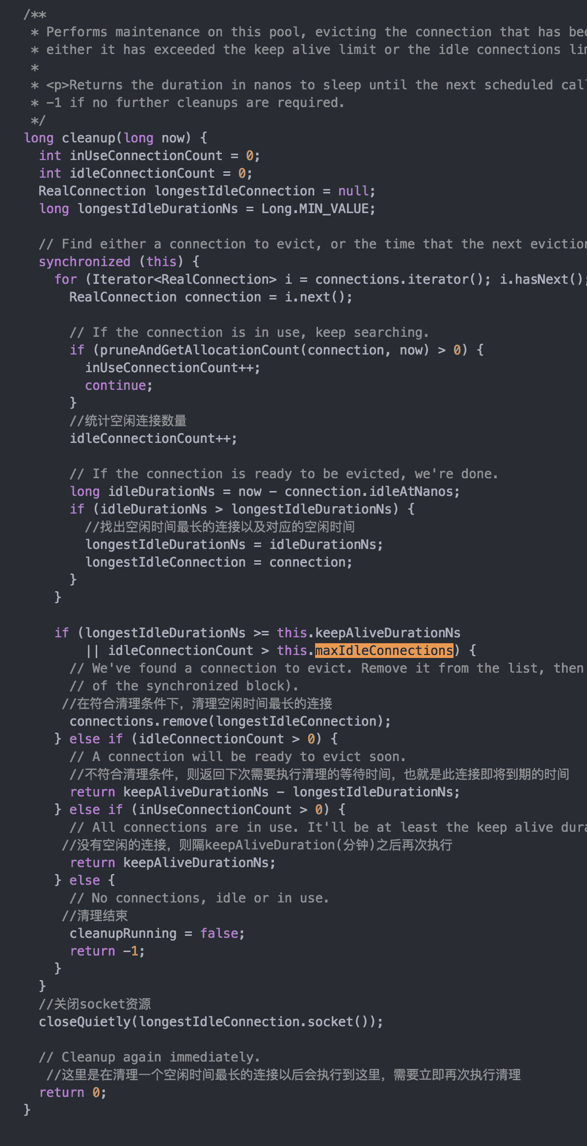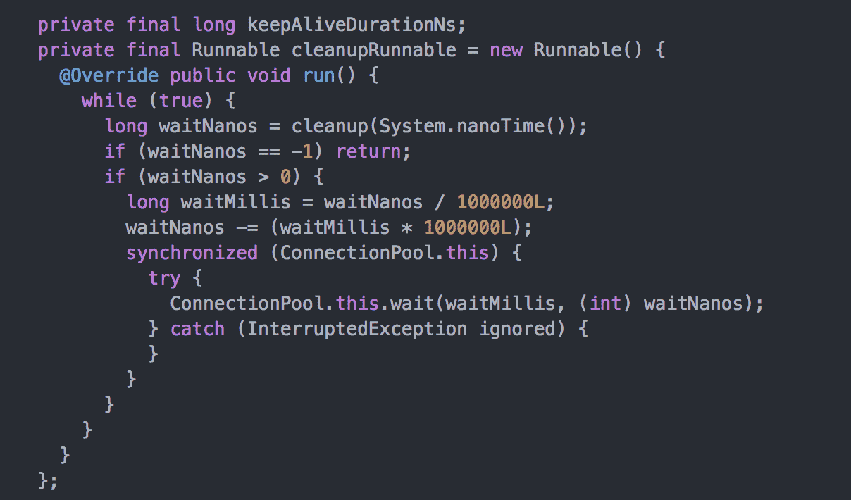 在ConectionPool中有一个异步线程去清除连接池中的连接,首先通过cleanup方法执行清除,而后等待clean返回的时间后,再次进行清除,以此循环,持续清除。