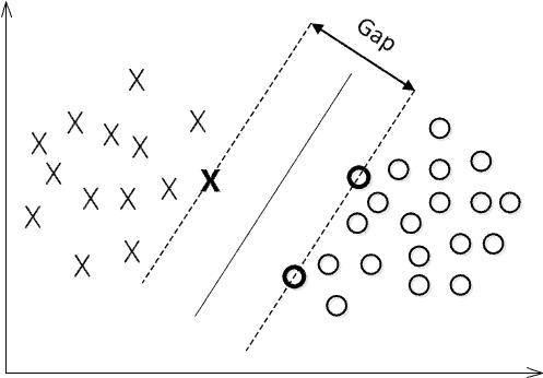 SVM的目标是找到一个超平面,这个超平面能够很好的处理二分类问题,所以先找到各个分类的样本点离这个超平面最近的点,使得这个点到超平面的距离最大化,最近的点就是虚线所画的。由以上超平面公式计算得出大于1的就属于打叉分类,假如小于0的属于圆圈分类。
