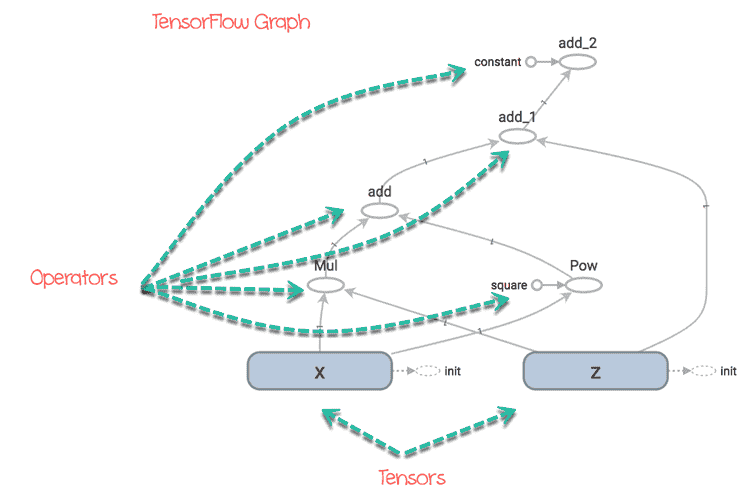 张量表示在操作之间进行的数据。 您之前看到过如何初始化张量。 常量和变量之间的差异是变量的初始值将随时间变化。