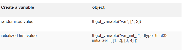 tf.get_variable(name = "", values, dtype, initializer)argument- `name = ""`: Name of the variable- `values`: Dimension of the tensor- `dtype`: Type of data. Optional- `initializer`: How to initialize the tensor. OptionalIf initializer is specified, there is no need to include the `values` as the shape of `initializer` is used.