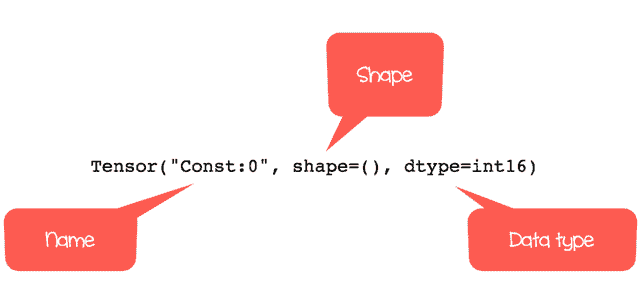 >>> r2 = tf.constant(1, tf.int16, name = "my_scalar")>>> r2<tf.Tensor 'my_scalar:0' shape=() dtype=int16>>>> r1_decimal = tf.constant(1.12345, tf.float32)>>> r1_decimal<tf.Tensor 'Const_1:0' shape=() dtype=float32>>>> r1_string = tf.constant("https://china-testing.github.io", tf.string)>>> r1_string<tf.Tensor 'Const_2:0' shape=() dtype=string>