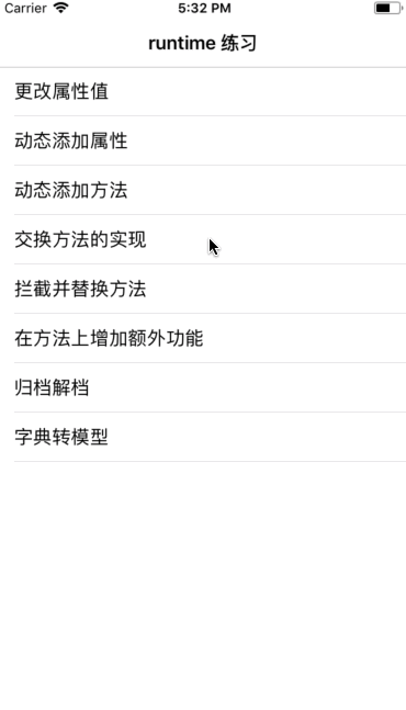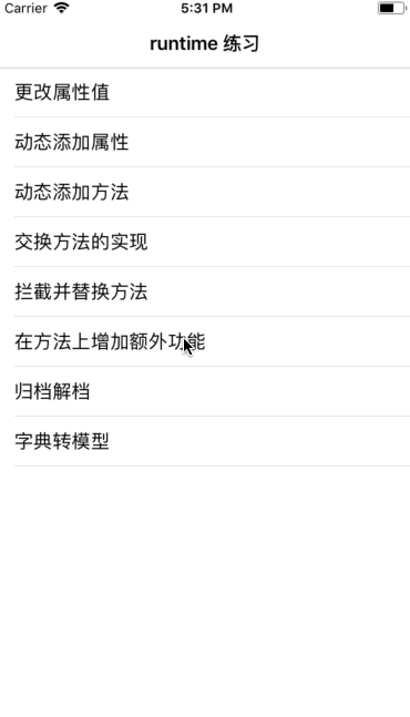 这个用场景还是挺多的, 比方我们需要记录 APP 中某一个按钮的点击次数, 这个时候我们便可以利使用 runtime 来实现这个功能. 我这里写了个 UIButton 的子类, 而后在 + (void)load 中使用 runtime 给它添加了一个功能, 核心代码及实现效果图如下:
