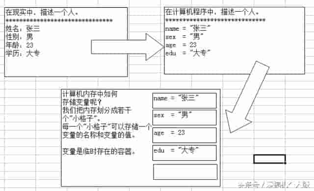 变量是临时存在的数据。我们可以把计算机内存看成是一个一个的“小格子”。每个“小格子”里可以存储一个变量的名称和变量的值。
