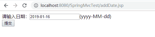 <%@ page language="java" contentType="text/html; charset=UTF-8" pageEncoding="UTF-8"%><!DOCTYPE html PUBLIC "-//W3C//DTD HTML 4.01 Transitional//EN" "http://www.w3.org/TR/html4/loose.dtd"><html><head><meta http-equiv="Content-Type" content="text/html; charset=UTF-8"></head><body> <form action="testDateConverter" method="post"> 请输入日期:<input type="text" name="date"/>(yyyy-MM-dd)<br/> <input type="submit" value="提交"/> </form></body></html>