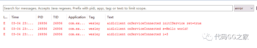首先,我们运行一下server端,打开remote远程AidlService,使其在运行中。而后运行Client应用,打Log,结果如下: