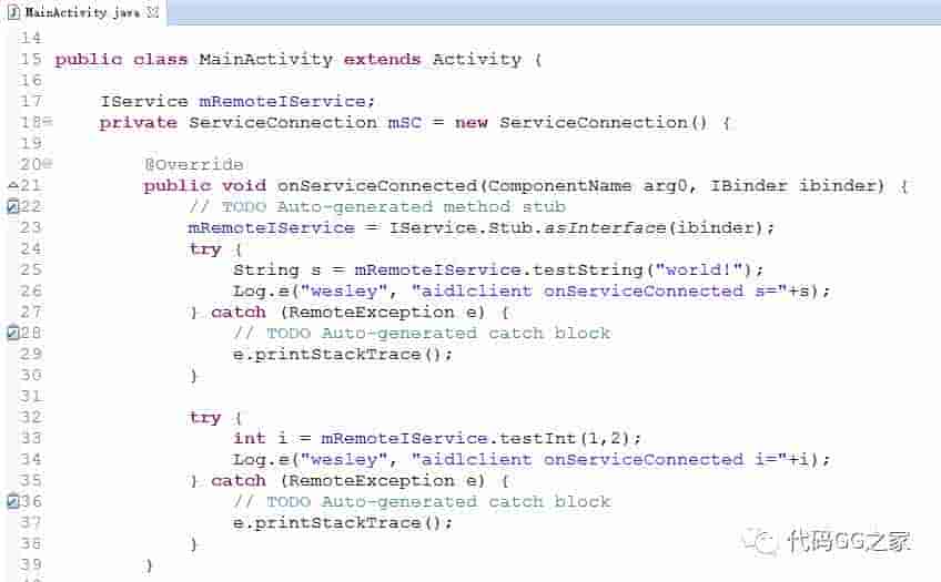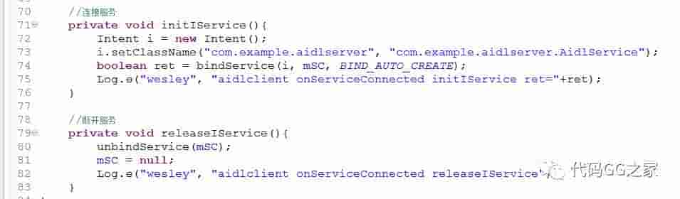 2. 在Client端的MainActivity中,实现一个ServiceConnection对象,在这个对象的onServiceConnected回调方法中,即可以拿到我们所需要的提供远程服务的对象。