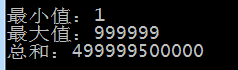nums=list(range(1,1000000))print('最小值:'+str(min(nums))) print('最大值:'+str(max(nums))) print('总和:'+str(sum(nums)))