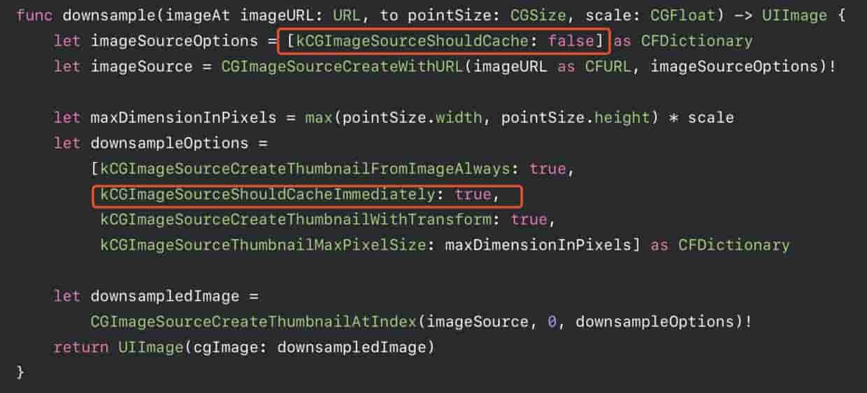 。方法的第二个参数 options 传入一个字典进行配置。根据 Apple 在 WWDC 2018 上的 Image and Graphics Best Practices 上的例子,当不需要解码仅需要创立 CGImageSource 的时候,应该将 kCGImageSourceShouldCache 设为 false。