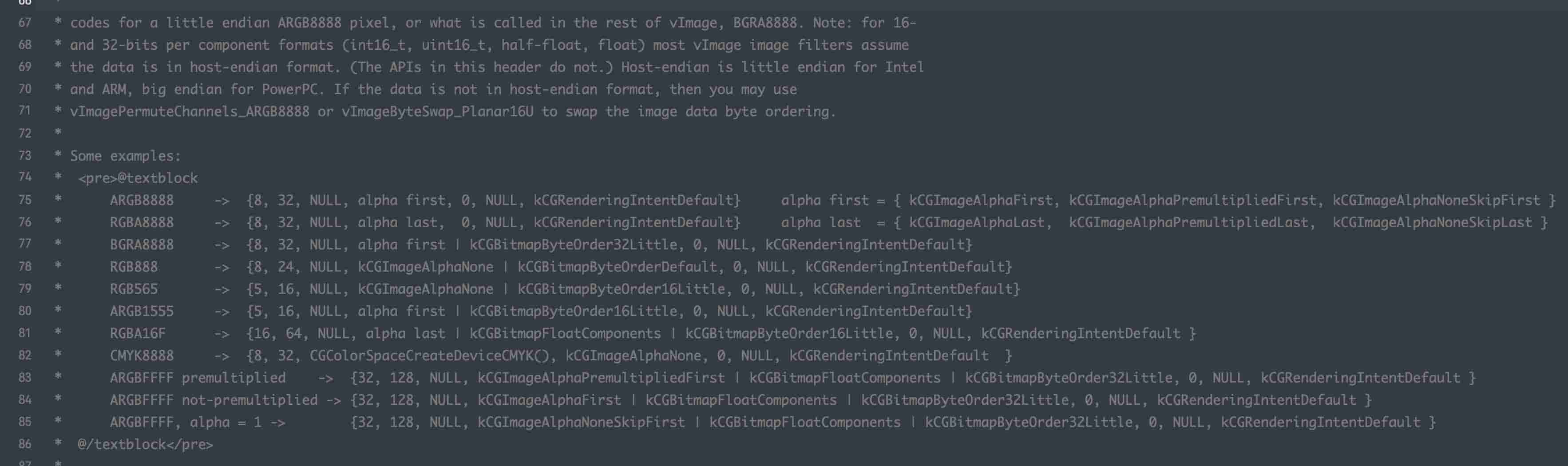 那么对于常用的色彩深度,即可以用这些参数的组合来完成。同时笔者在查看更底层的 vImage 框架的 vImage_CGImageFormat 结构体时(CGImage 底层也是使用 vImage,具体可查看 Accelerate 框架 vImage 库的 vImage_Utilities 文件),发现了 Apple 的注释,里面也包含了常用的色彩深度用的参数。