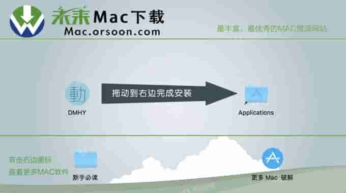 DMHY Mac版镜像包下载完成后打开,将左侧的【DMHY】拉到右侧应用程序中就可~