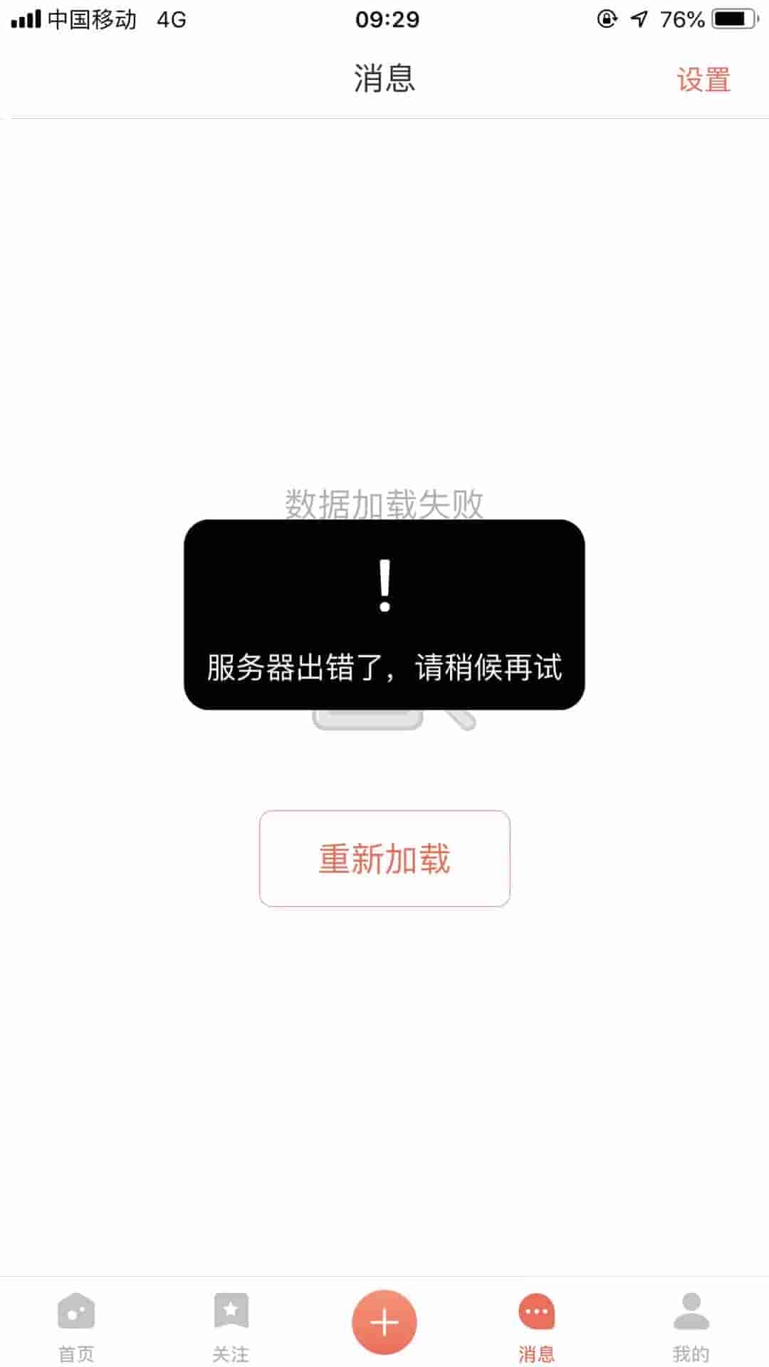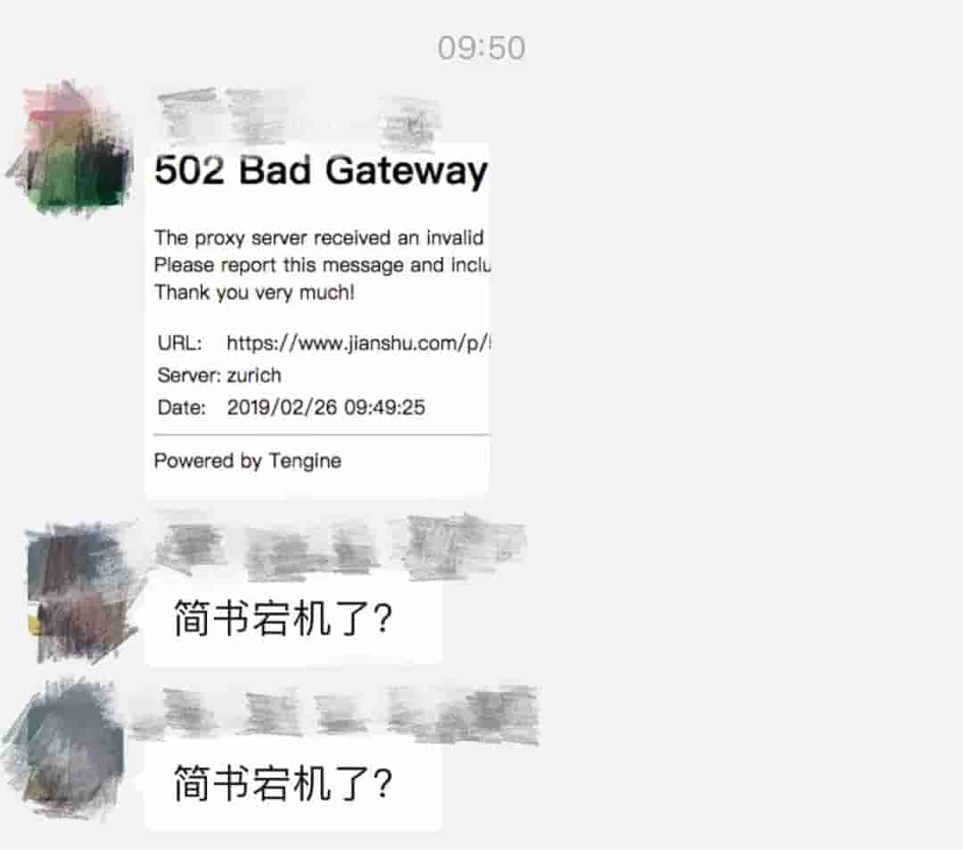 9点29分,打开简书APP,提醒服务器出错,接着我又打开其余页面,以确保能否只有首页接口报错,同样提醒服务器出错,我又打开简书的分享链接,无法打开,很显著,宕机了!