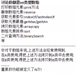 //表示数组的工具类,涵盖了很多操作数组的方法class ArrayUtil { //交换元素 static void swap(int[] arr,int index1,int index2) { int temp = arr[index1]; arr[index1] = arr[index2]; arr[index2] = temp; } //获取数组中最大元素 static int getMax(int[] nums) { int j = nums[0];//假设数组第一个值为最大值 for (int i = 1;i < nums.length ;i ++ ) { if (nums[i] > j) { j = nums[i];//就把最大值存储在j变量中 } } return j; } //获取数组中最小元素 static int getMin(int[] nums) { int k = nums[0];//假设数组第一个值为最小值 for (int i = 1;i < nums.length ;i ++ ) { if (nums[i] < k) { k = nums[i];//就把最大值存储在k变量中 } } return k; } //打印数组 static void print(int[] arr) { //思路:先打印数组"[]",再获取arr数组里面的元素,而后再做if判断,判断假如当前i的值不是最后一个索引,则拼接 if (arr == null) { System.out.println("null"); return; } String ret = "["; for (int i = 0;i < arr.length ;i ++ ) { ret = ret + arr[i]; //假如当前i不是最后一个索引,则拼接", " if (i != arr.length - 1) { ret = ret + ", "; } } ret = ret + "]"; System.out.println(ret); } //逆序排序 static String[] reverse(String[] oldArr) { //创立一个新的数组,存储颠倒之后的元素 String[] newArr = new String [oldArr.length]; for (int i = oldArr.length - 1;i >= 0 ;i -- ) { //i = 4 newArr[0] //i = 3 newArr[1] newArr[oldArr.length - 1 - i] = oldArr[i]; } return newArr; } //二分搜索法/二分查找法/折半查找 static int binarySearch(int[] arr,int key) { int low = 0;//最小的索引 int high = arr.length - 1;//最大的索引 while (low <= high) { System.out.println(low+"----------"+high); int mid = (low + high) >> 1 ;//中间索引 int midVal = arr[mid];//将中间索引的元素赋值给变量midVal if(midVal > key)//猜大了 { high = mid - 1;//最大的索引=中间索引-1(缩小搜索范围) } else if(midVal < key)//猜小了 { low = mid + 1;//最小的索引=中间索引+1(缩小搜索范围) } else { return mid;//假如中间索引恰好=key值,就直接返回mid } } return -1;//如果说传入的元素没有在数组中,直接返回-1,表示不在该数组范围内,越界了. } //选择排序 static void selectinonSort(int[] arr) { /* //第一轮 for (int i = 1;i <= arr.length - 1 ;i ++ ) { if (arr[0] > arr[i]) { swap(arr,0,i); } } //第二轮 for (int i = 2;i <= arr.length - 1 ;i ++ ) { if (arr[1] > arr[i]) { swap(arr,1,i); } } //第三轮 for (int i = 3;i <= arr.length - 1 ;i ++ ) { if (arr[2] > arr[i]) { swap(arr,2,i); } } */ //代码增强 for (int j = 1;j <= arr.length - 1;j ++ ) { for (int i = j;i <= arr.length - 1 ;i ++ ) { if (arr[j - 1] > arr[i]) { swap(arr,j - 1,i); } } } } //冒泡排序 static void sort(int[] arr) { //代码增强 for (int i = 1;i <= arr.length - 1 ;i ++ ) { for (int j = 1;j <= arr.length - i ;j ++ ) { if (arr[j - 1] > arr[j]) { swap(arr,j-1,j); } } } /* //第一轮 for (int i = 1;i <= arr.length - 1 ;i ++ ) { if (arr[i - 1] > arr[i]) { swap(arr,i-1,i); } } //第二轮 for (int i = 1;i <= arr.length - 2 ;i ++ ) { if (arr[i - 1] > arr[i]) { swap(arr,i-1,i); } } //第三轮 for (int i = 1;i <= arr.length - 3 ;i ++ ) { if (arr[i - 1] > arr[i]) { swap(arr,i-1,i); } } */ } static void copy(int[] src,int srcPos,int[] dest,int destPos,int length) { /* //拷贝3 dest[destPos]=src[srcPos]; //拷贝4 srcPos++; destPos++; dest[destPos]=src[srcPos]; //拷贝5 srcPos++; destPos++; dest[destPos]=src[srcPos]; //拷贝6 srcPos++; destPos++; dest[destPos]=src[srcPos]; */ //优化后的代码 //i等于每次需要拷贝元素的索引 for (int i = srcPos;i < srcPos + length;i ++ ) { dest[destPos] = src[i]; destPos++; } }//元素第一次索引 static int indexOf(int[] arr,int key) { for (int index = 0;index < arr.length ;index ++ ) { if (arr[index] == key) { return index; } } return -1; }//最后一次 static int lastIndexOf(int[] arr,int key) { for (int index = arr.length-1;index >=0 ;index -- ) { if (arr[index] == key) { return index; } } return -1; }}