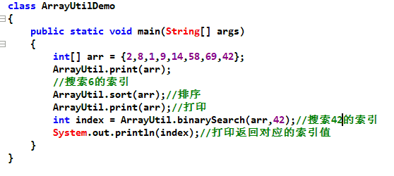 class ArrayUtilDemo { public static void main(String[] args) { int[] arr = {2,8,1,9,14,58,69,42}; ArrayUtil.print(arr); //搜索6的索引 ArrayUtil.sort(arr);//排序 ArrayUtil.print(arr);//打印 int index = ArrayUtil.binarySearch(arr,42);//搜索42的索引 System.out.println(index);//打印返回对应的索引值 }}