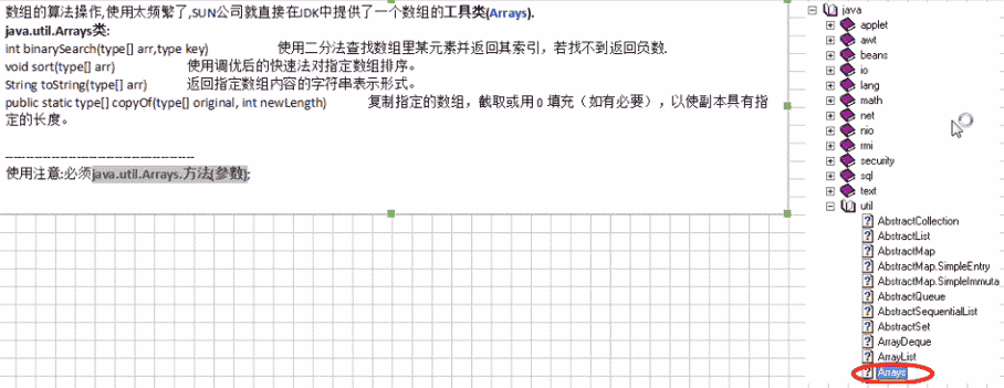 //演示数组的工具类,Arrays类class ArraysDemo { public static void main(String[] args) { int[] arr = {2,8,1,9,14,58,69,42}; String ret = java.util.Arrays.toString(arr);//打印数组元素 System.out.println(ret); java.util.Arrays.sort(arr);//排序数组 String ret1 = java.util.Arrays.toString(arr); System.out.println(ret1); java.util.Arrays.sort(arr);//二分搜索 int index = java.util.Arrays.binarySearch(arr,8); System.out.println(index); }}