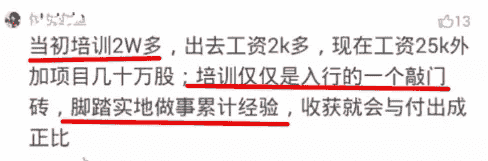 网友四:其实说白了,想要在这个行业中挣大钱。还是得拿经验说话,起初培训只是一个敲门砖。我花两万培训,刚开始工资两千,现在两万五。